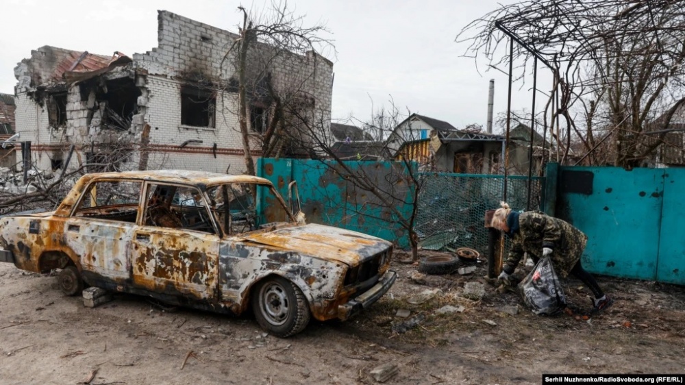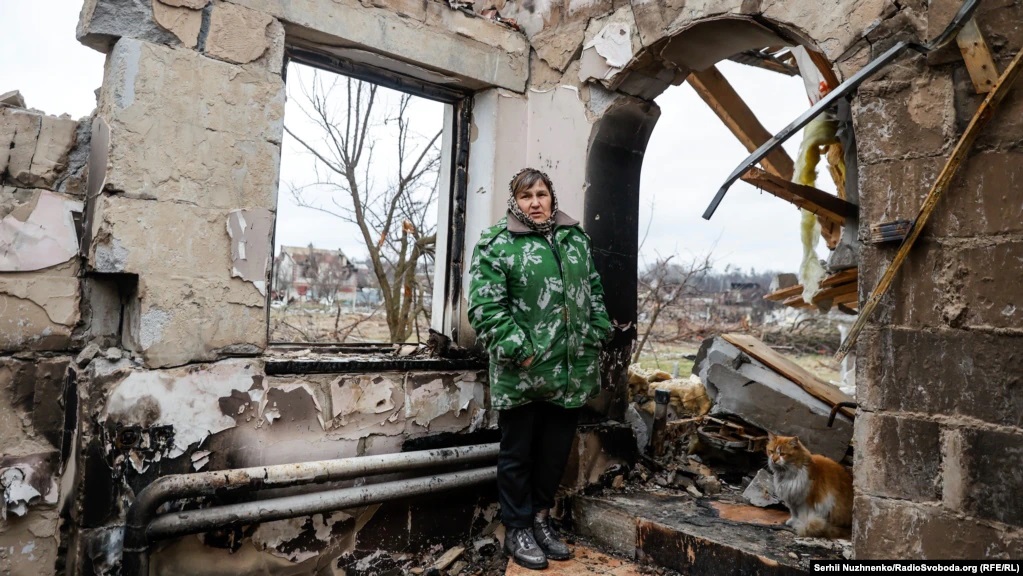 Местная жительница Людмила пытается хоть немного убрать возле своего дома, которому удалось уцелеть. 6 апреля 2022 года