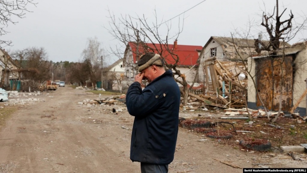 Мужчина плачет на своей уничтоженной русскими артиллерийскими и авиаударами улице. Чернигов, 6 апреля 2022 года