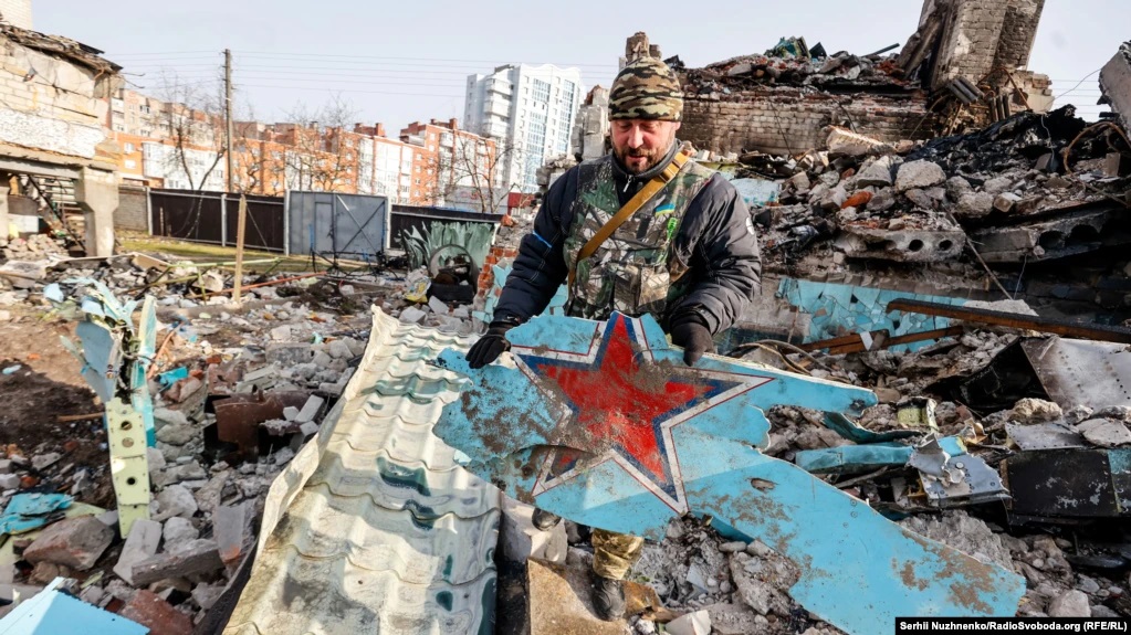 Доброволец территориальной обороны держит обломок российского истребителя Су-34, сбитого украинскими ПВО, 6 апреля 2022 года