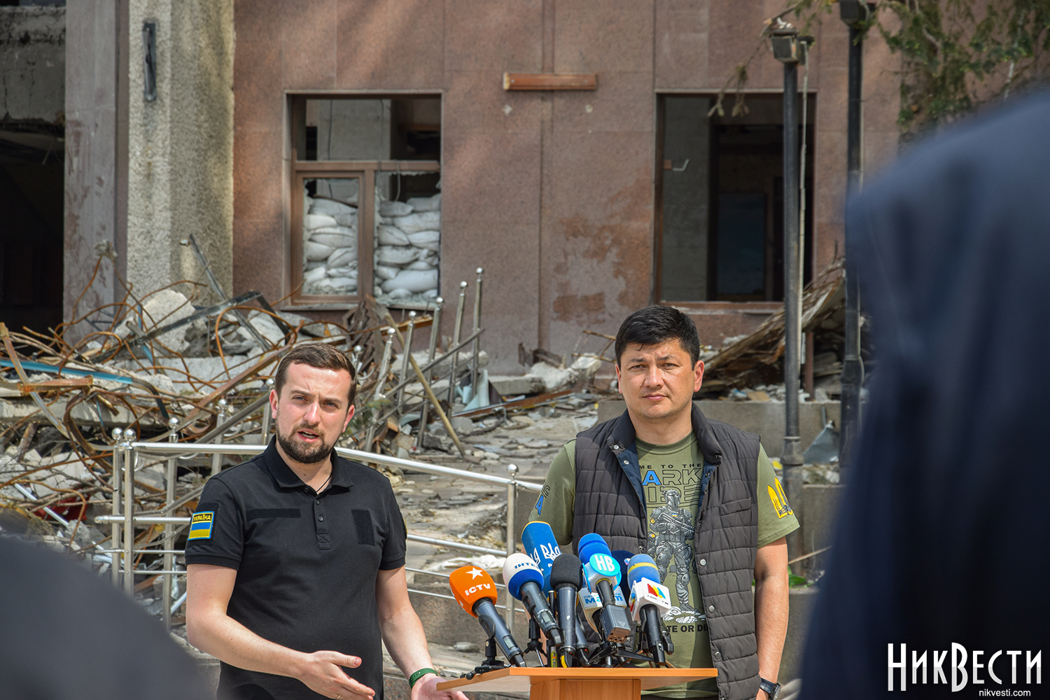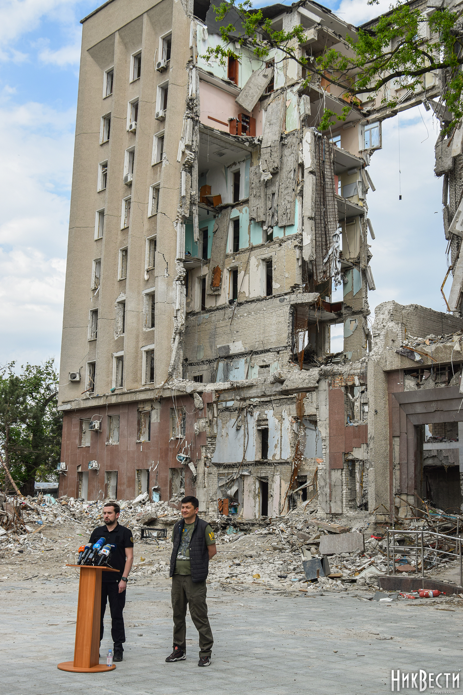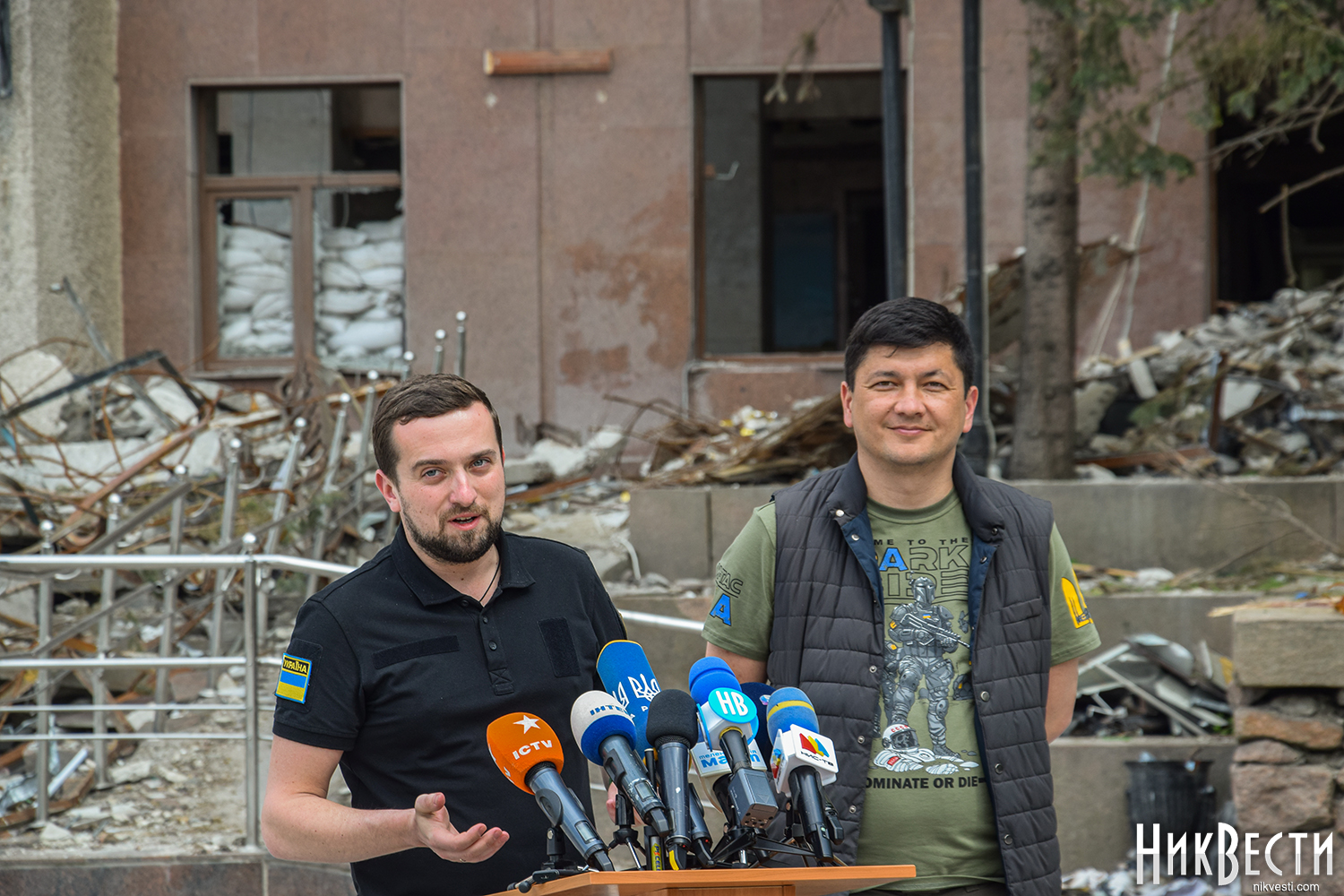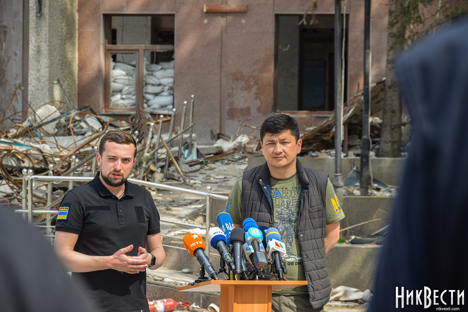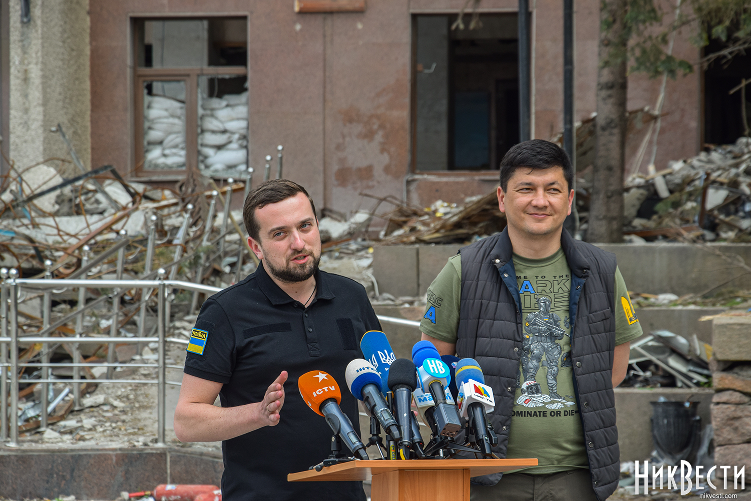 У здания разрушенной Николаевской ОГА вместе с военным губернатором Виталием Кимом они дали пресс-конференцию для журналистов Николаева, сообщают НикВести.
