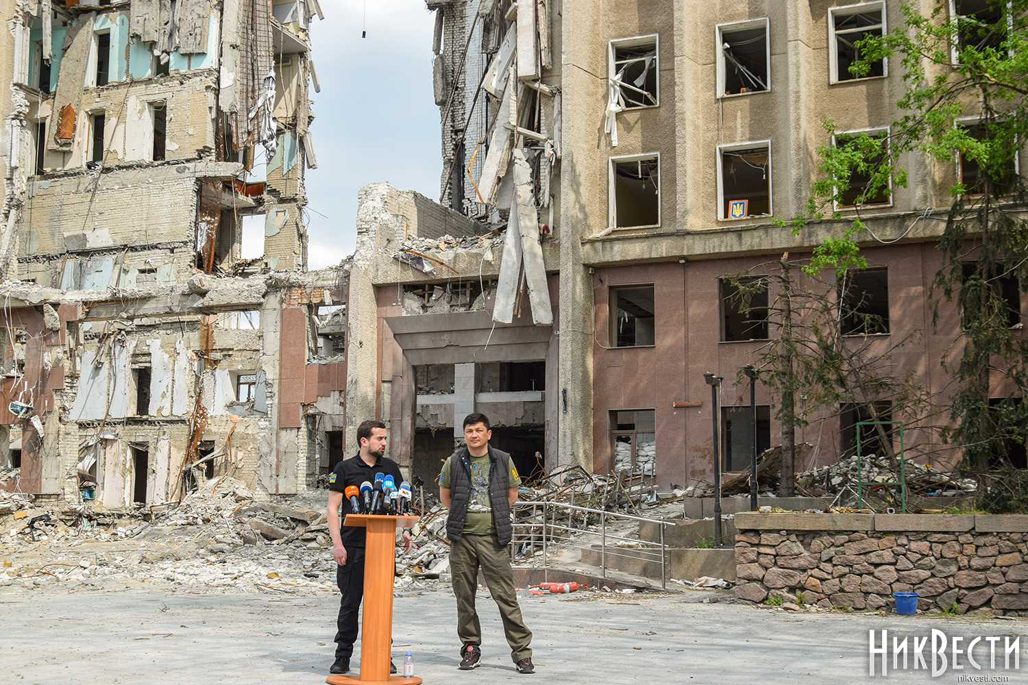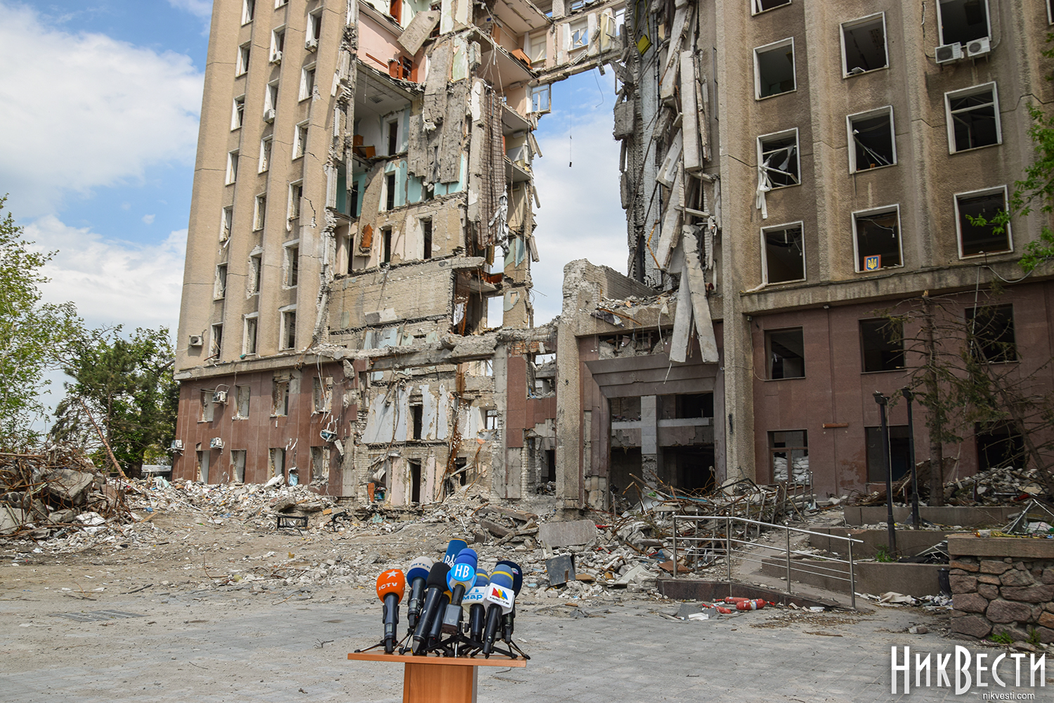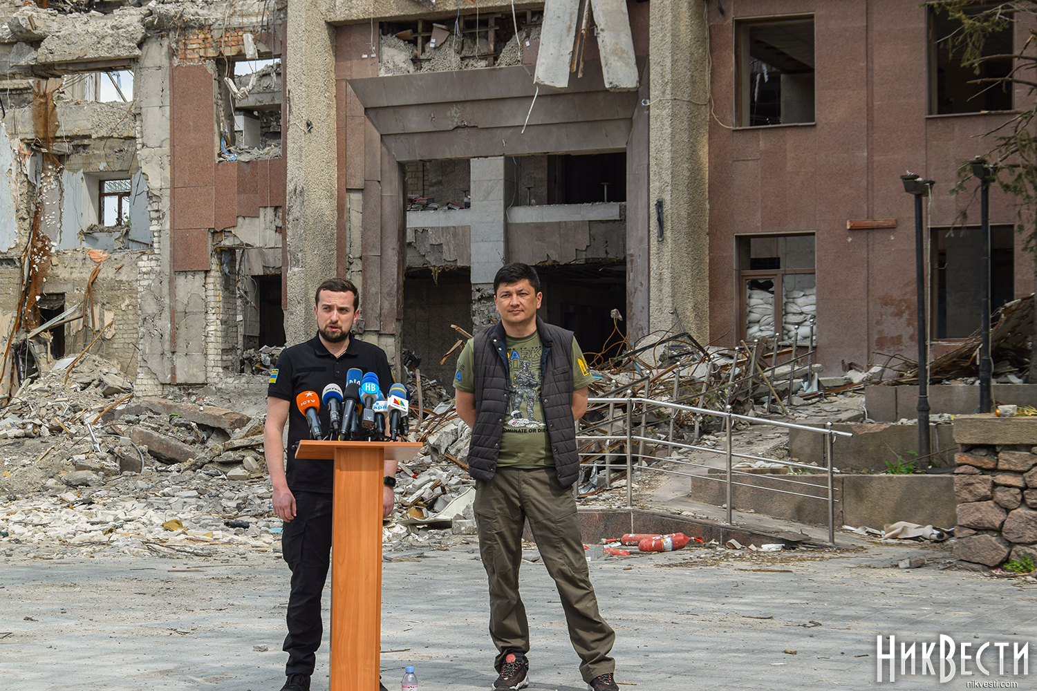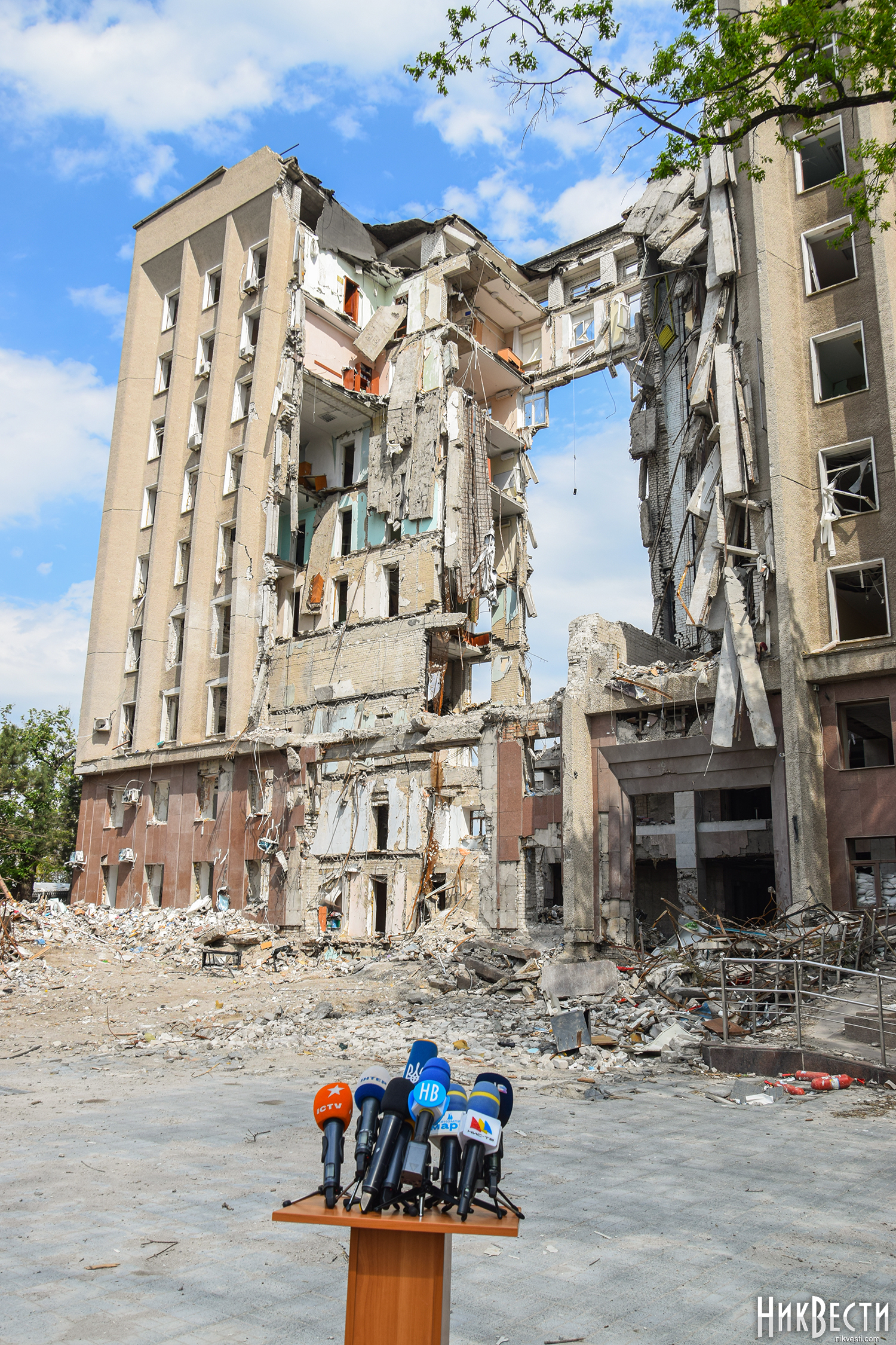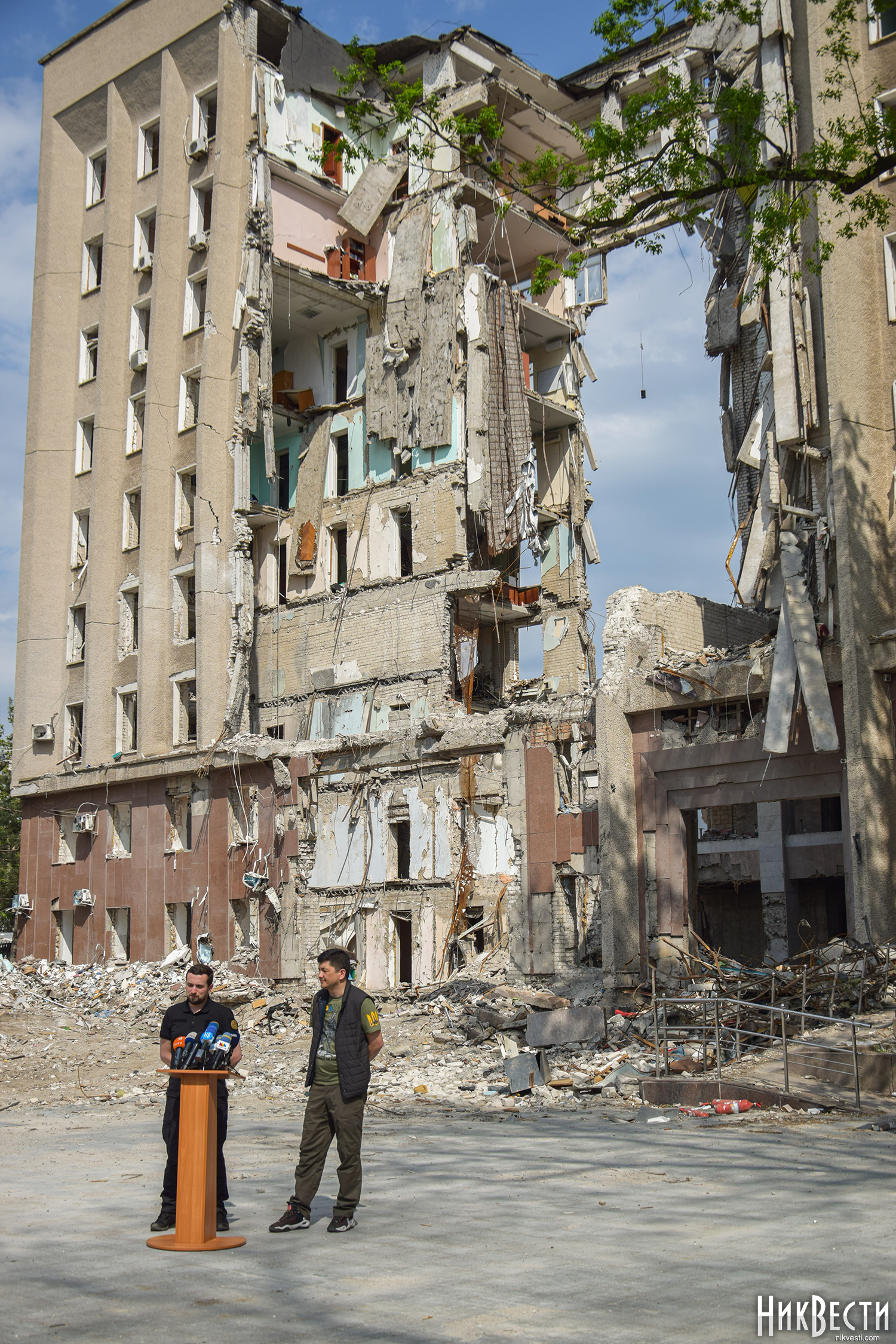 У здания разрушенной Николаевской ОГА вместе с военным губернатором Виталием Кимом они дали пресс-конференцию для журналистов Николаева, сообщают НикВести.