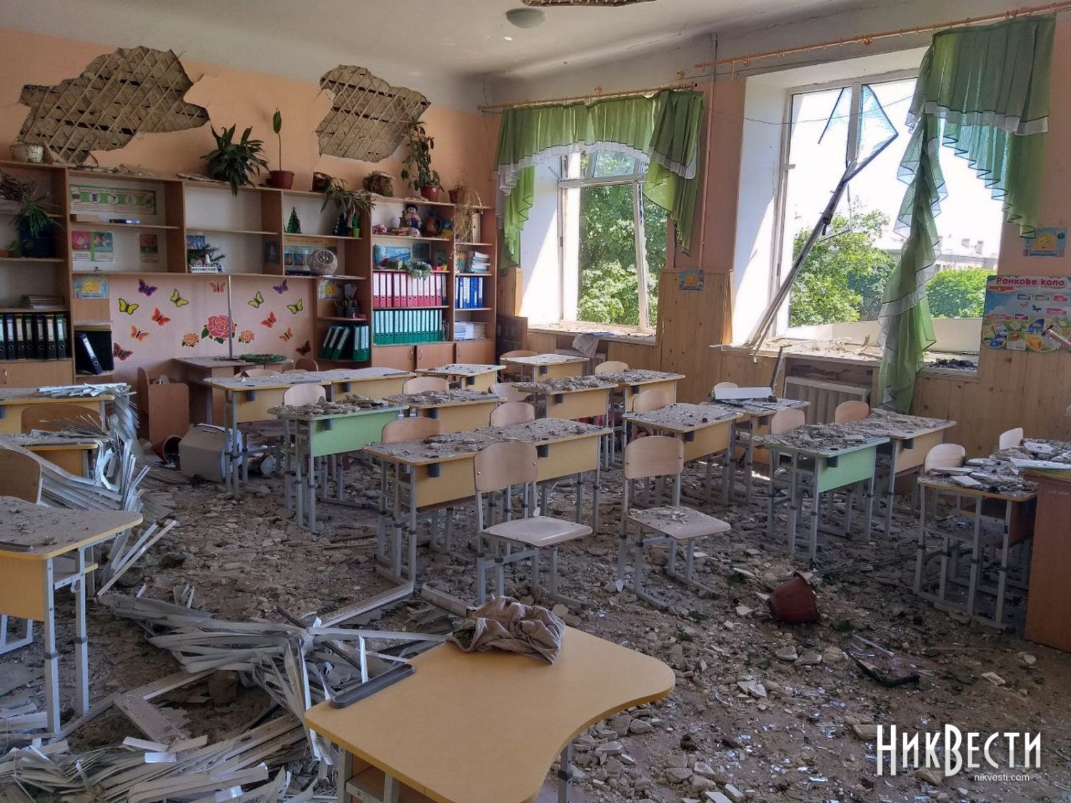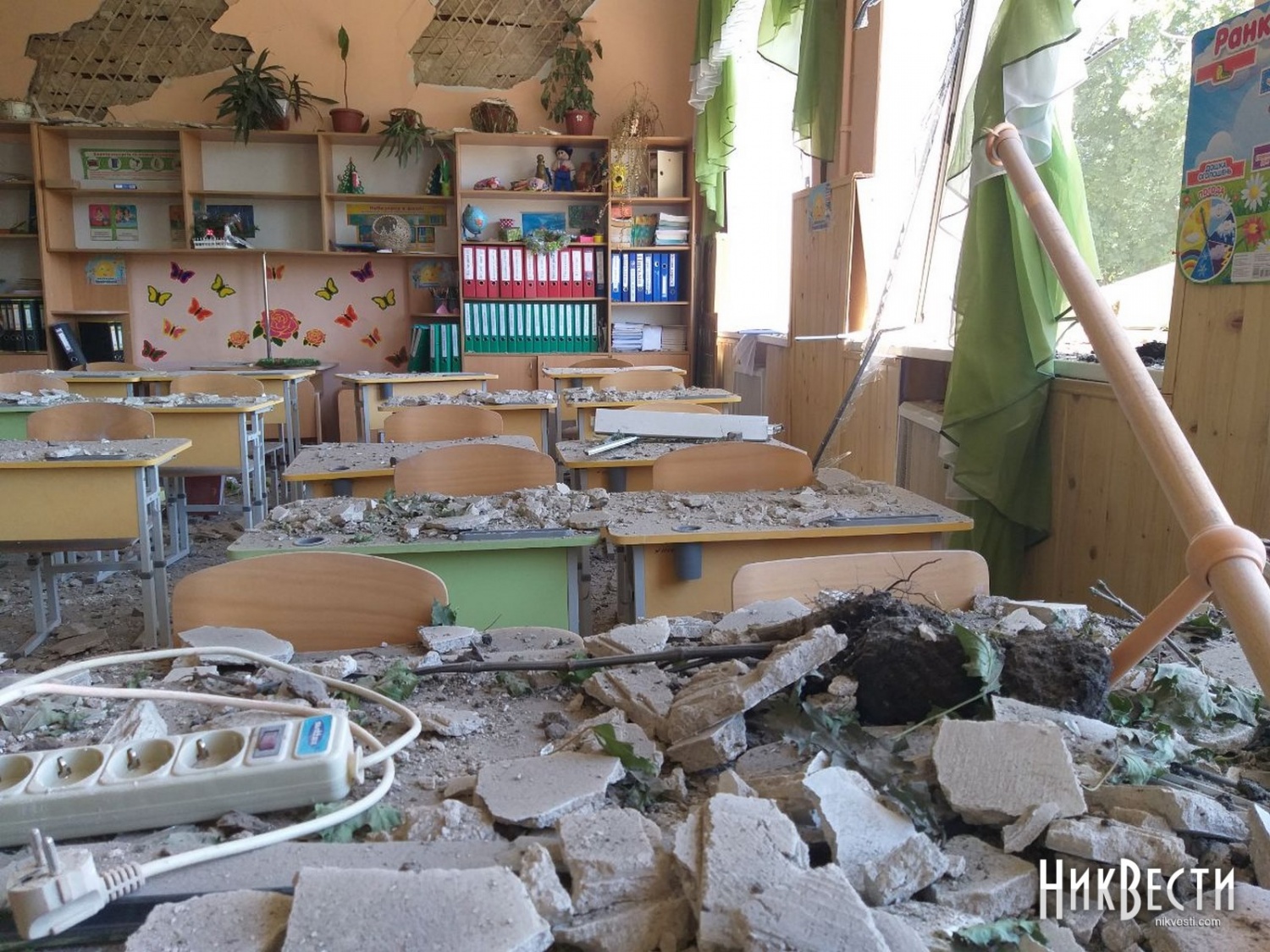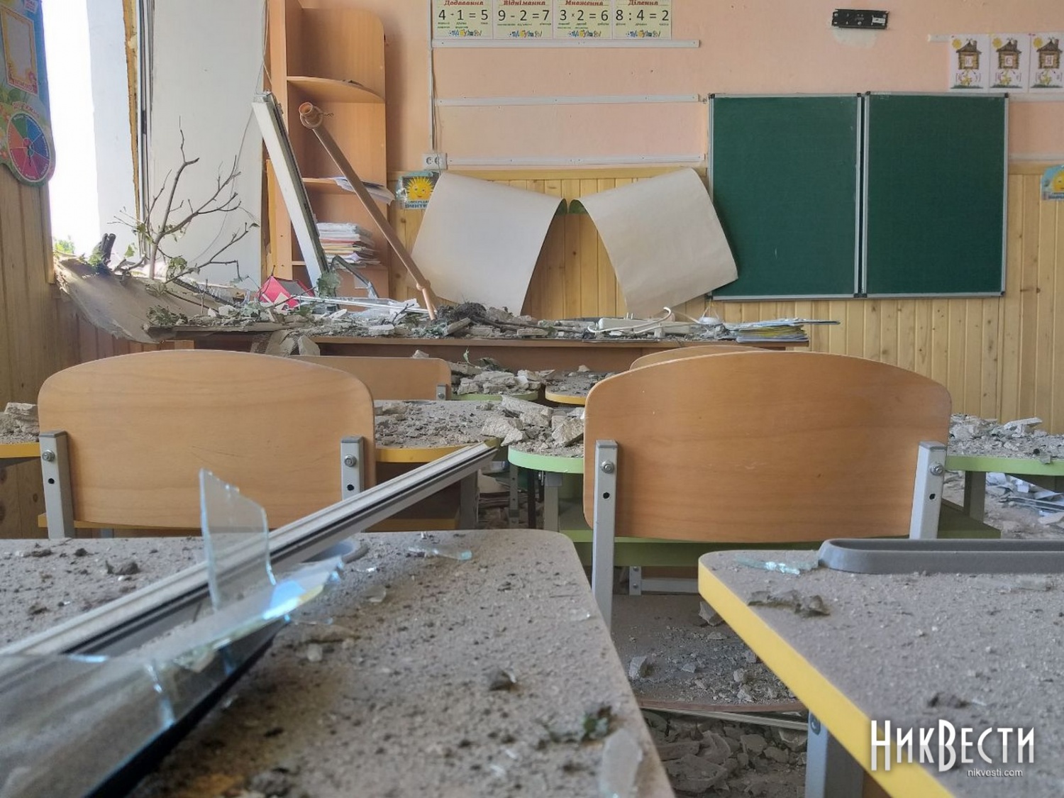 В другой школе удар пришелся по прилегающей территории. Взрывной волной в заведении выбило окна и двери, частично сорвало штукатурку и потолок, повредило мебель и технику.