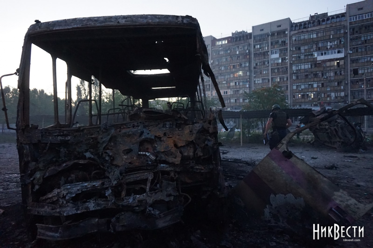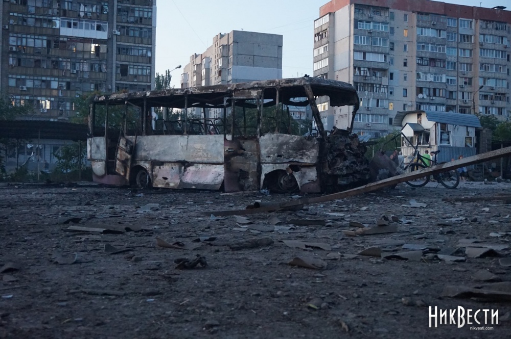 Также ракета попала в парковку рядом с многоквартирным домом. Сгорели автобус и легковые автомобили. Взрывной волной выбило окна и двери в самом доме. Информация о погибших пока не поступала, на месте продолжают работать спасатели, медики и полиция.