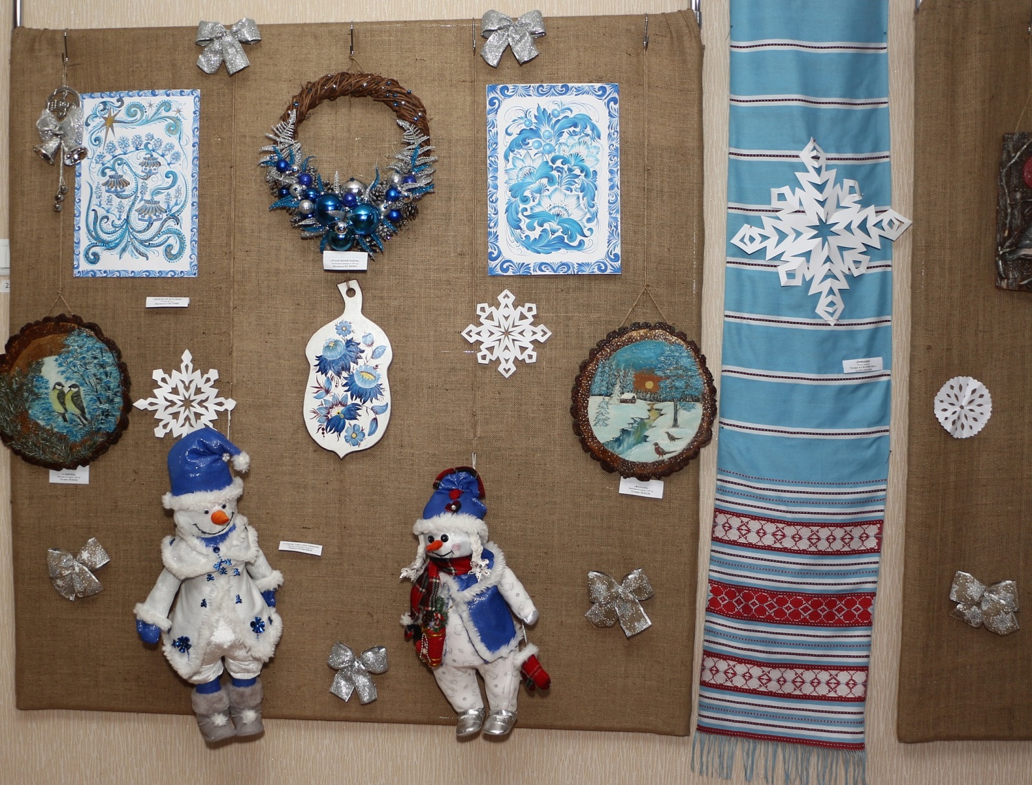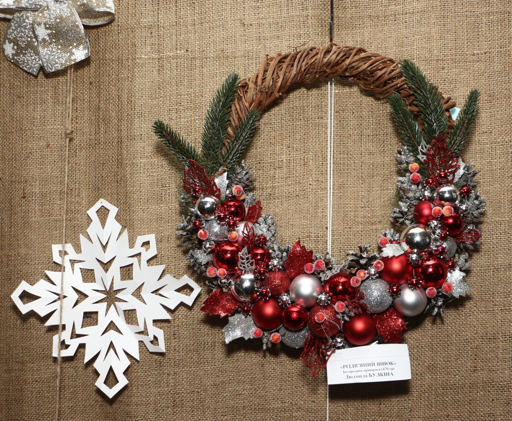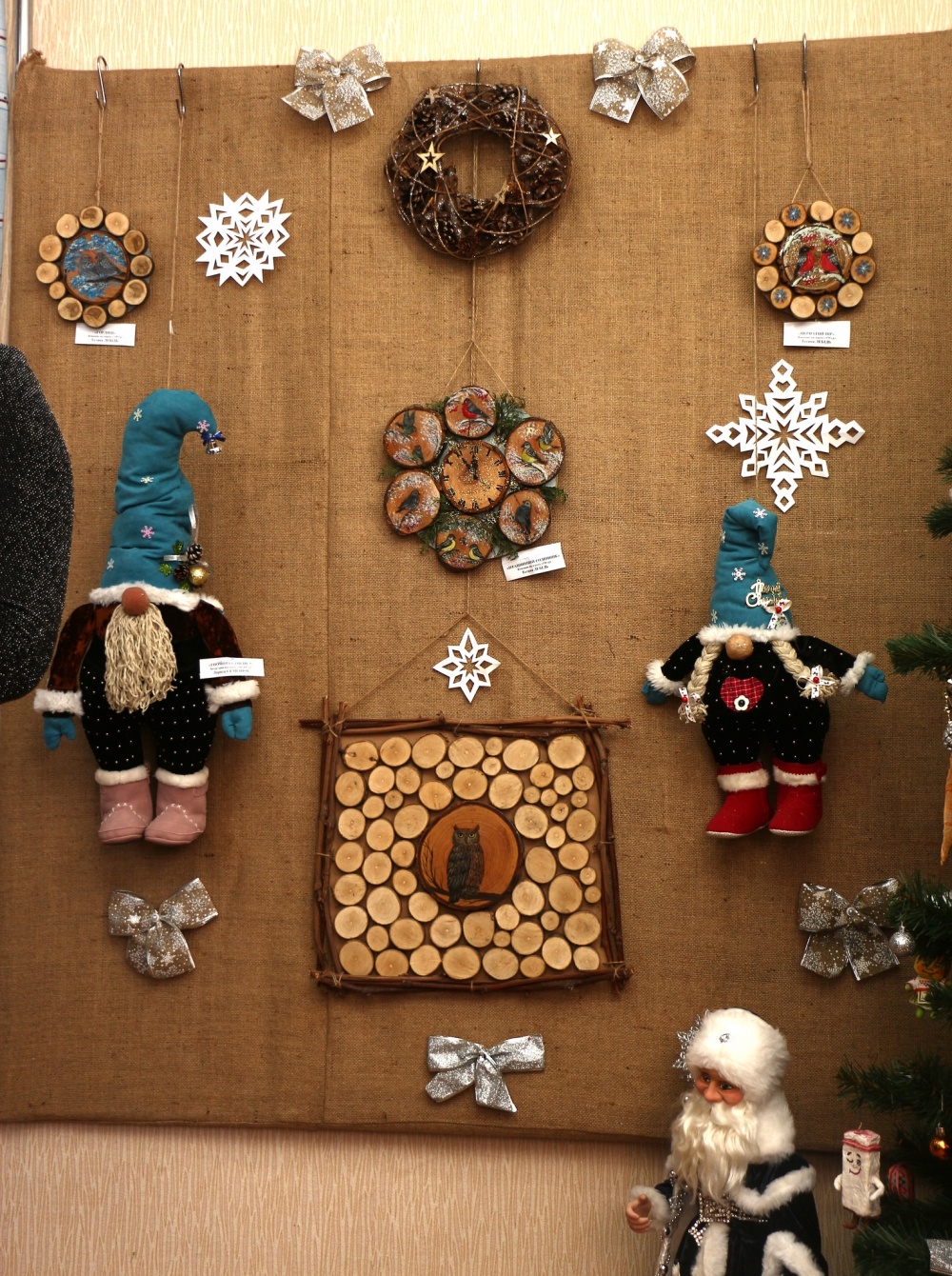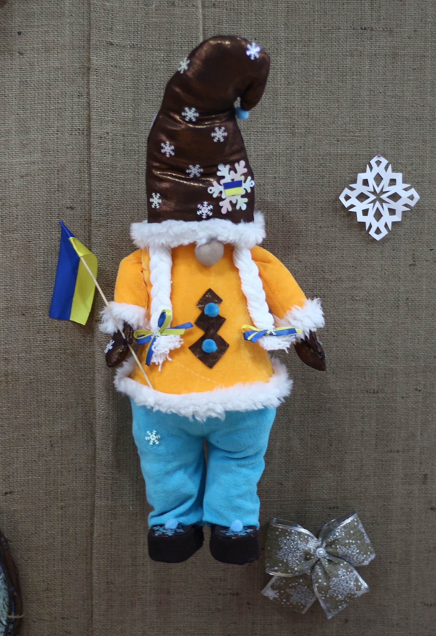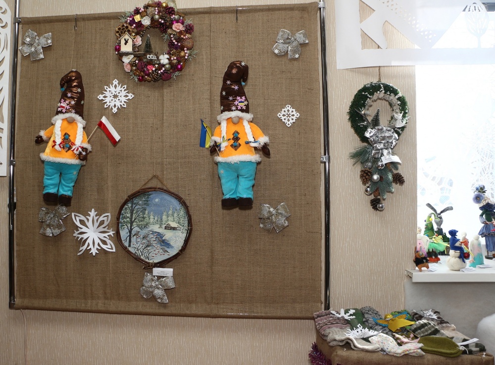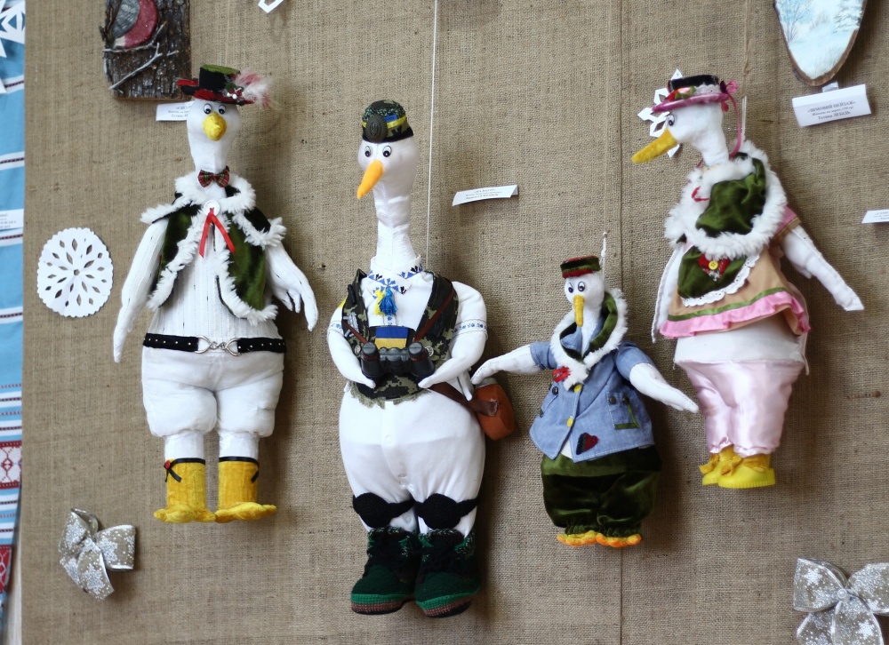 На выставке-аукционе представлены современные патриотические изделия: елка несокрушимости и игрушки, патриотические брелоки, украинские обереги и рождественские веночки, изделия из соломы, роспись по дереву, витинанки, новогодние куклы.