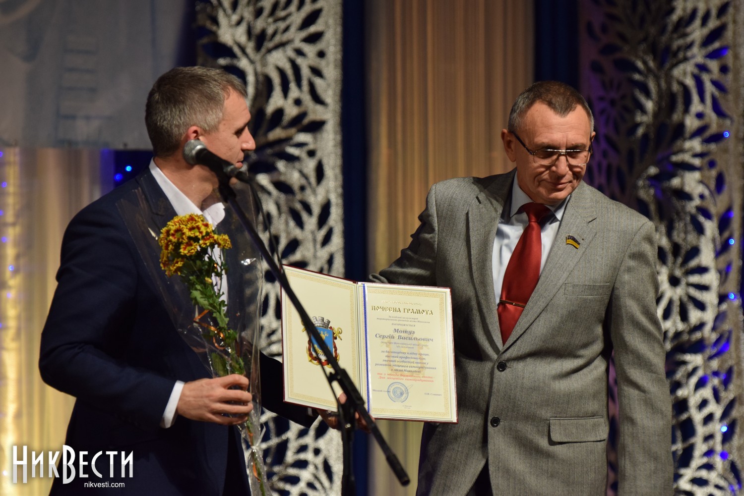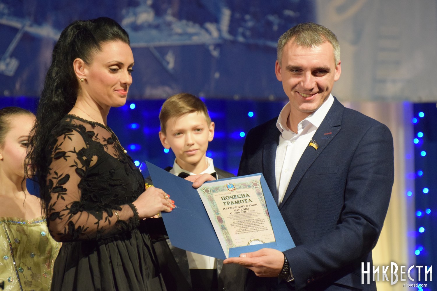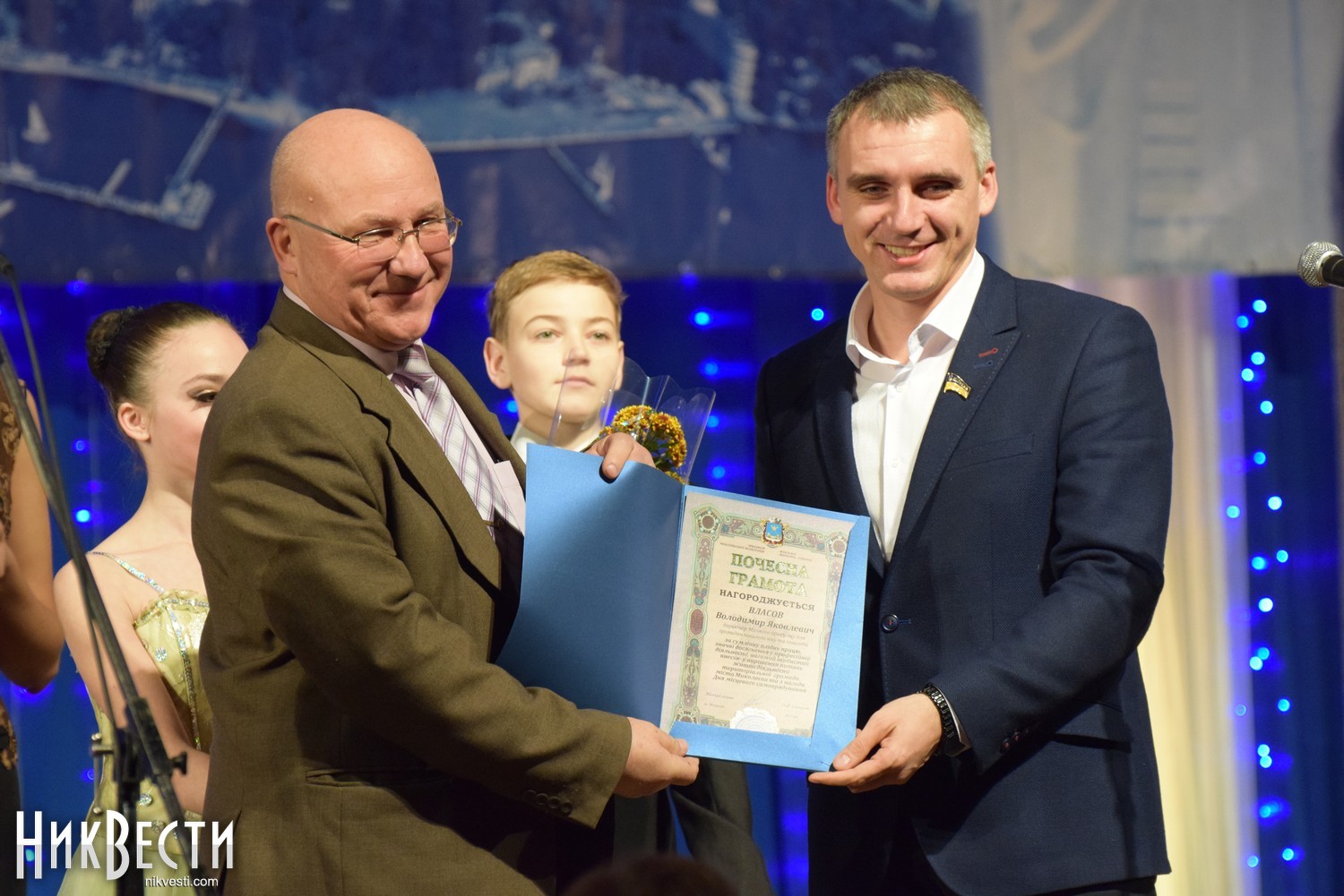 На сцене городского Дворца творчества учащихся состоялась непродолжительная церемония награждения, во время которой Александр Сенкевич пообещал, что не станет портить традицию поющих мэров Николаева и в ближайшее время возьмет уроки у двух более «подкованных» в этом вопросе депутатов.