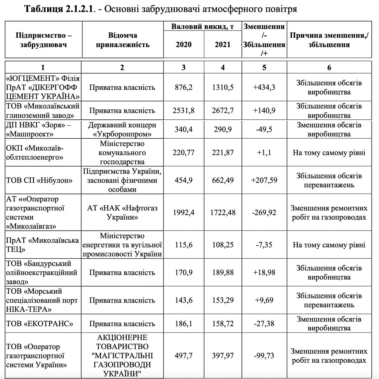 К крупнейшим загрязнителям относятся следующие предприятия: ООО «Николаевский глиноземный завод», АО «Оператор газотранспортной системы «Николаевгаз» и «Югцемент» Филиал ЧАО «Дикергофф Цемент Украина», суммарные выбросы которых составили 5,706 тыс. т, или 46,8% выбросы всех стационарных источников.