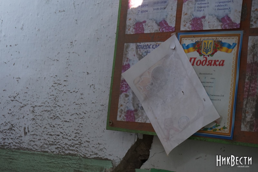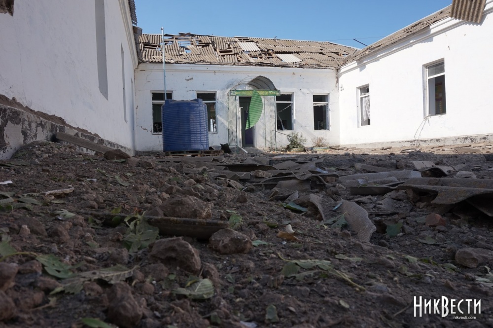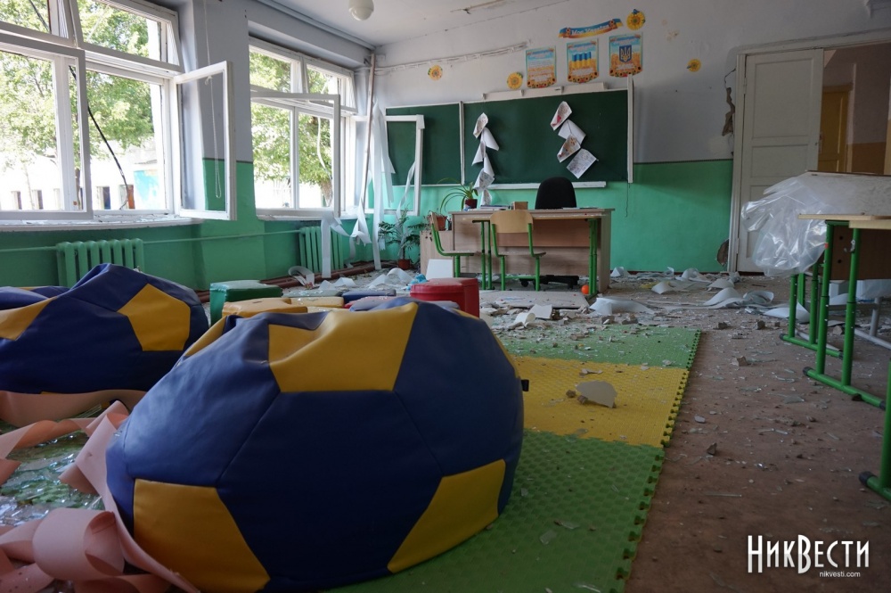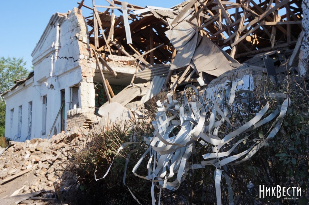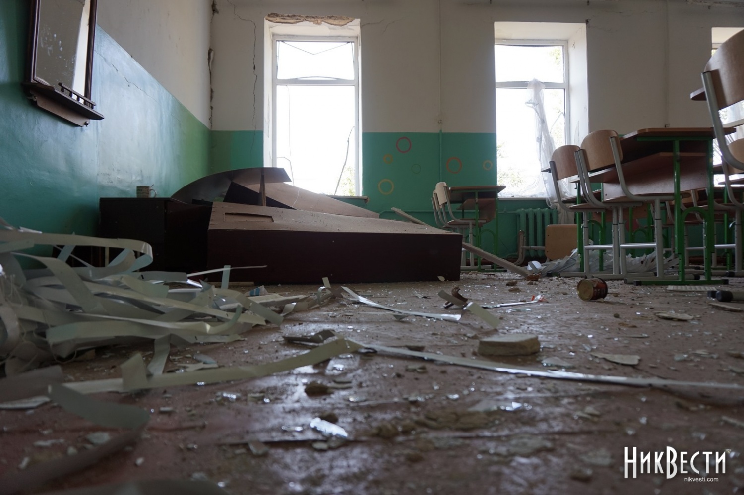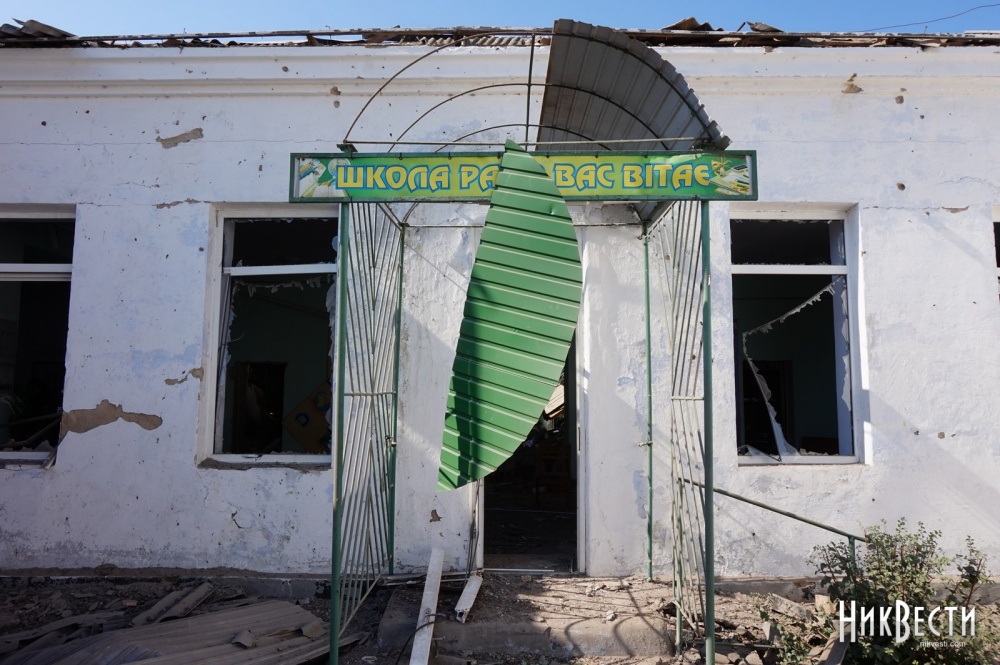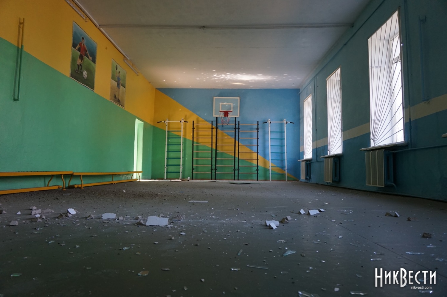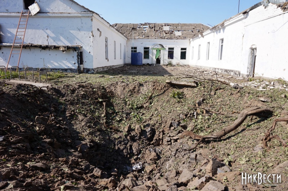 От снаряда в школьном дворе образовалась огромная воронка. Ракета разрушила большую часть здания, некоторые классы и другие помещения полностью разрушены. Пострадала техника, мебель, методические материалы, учебники и спортивный инвентарь.