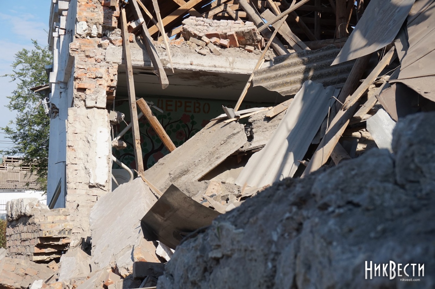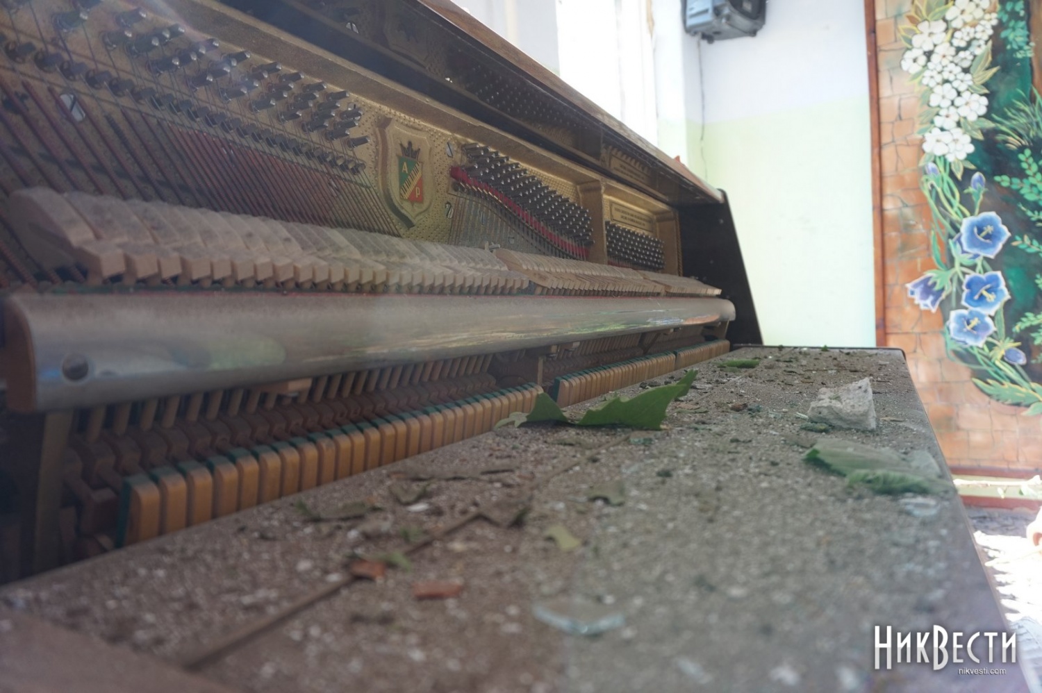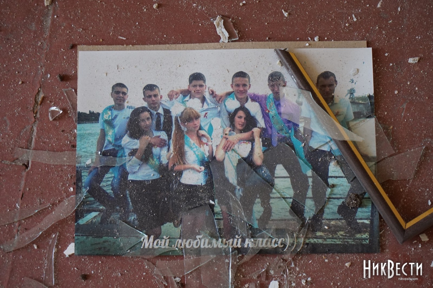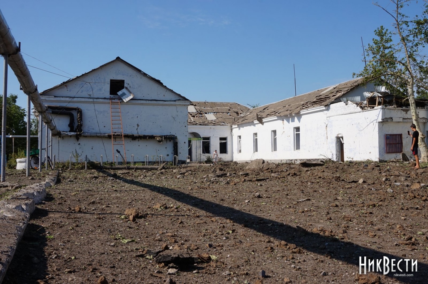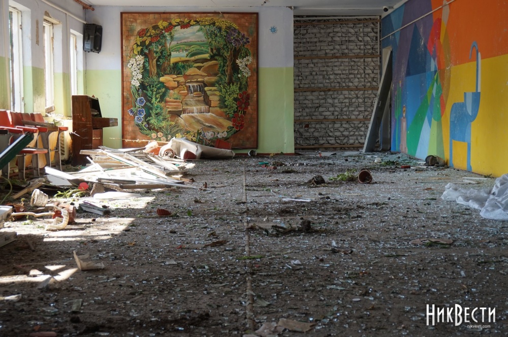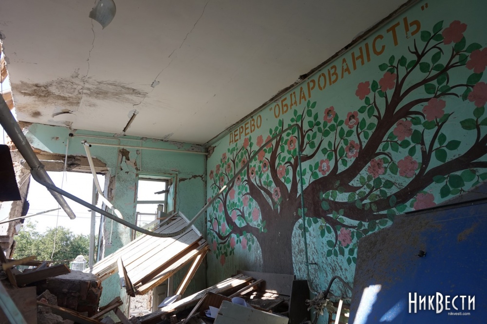 От снаряда в школьном дворе образовалась огромная воронка. Ракета разрушила большую часть здания, некоторые классы и другие помещения полностью разрушены. Пострадала техника, мебель, методические материалы, учебники и спортивный инвентарь.