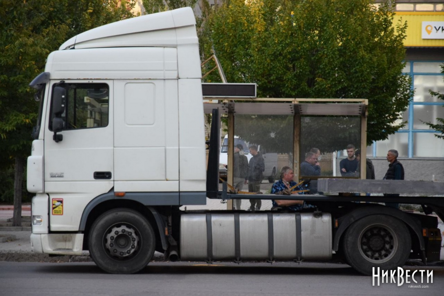 Вечером 22 сентября в Николаеве монтируют укрытие на остановке в Корабельном районе, которую в конце июля обстреляли российские войска.