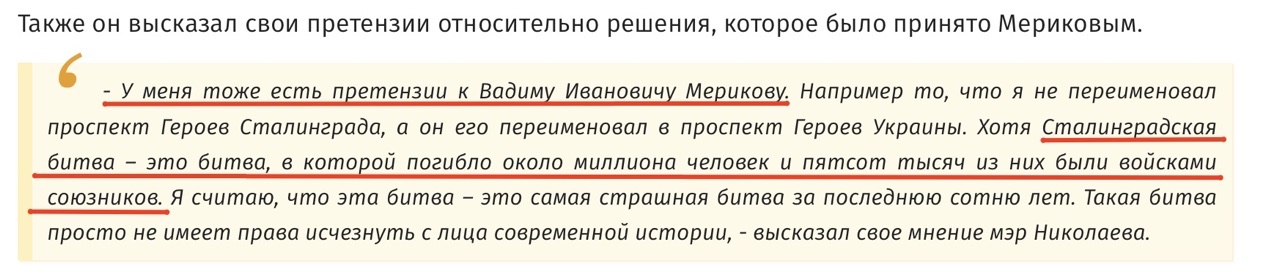 По – поводу битвы под Сталинградом и упреку Мерикову за переименование ПГСа в проспект Героев Украины, вот цитата: