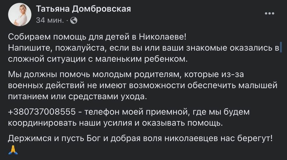 09:20 Депутат Николаевского горсовета Татьяна Домбровская заявила о готовности помочь горожанам, которые оказались без возможности обеспечить своих маленьких детей питанием или средствами ухода. Об этом она написала в своем Facebook сегодня утром.