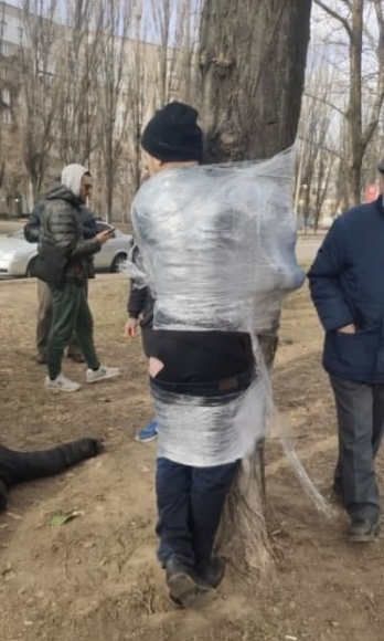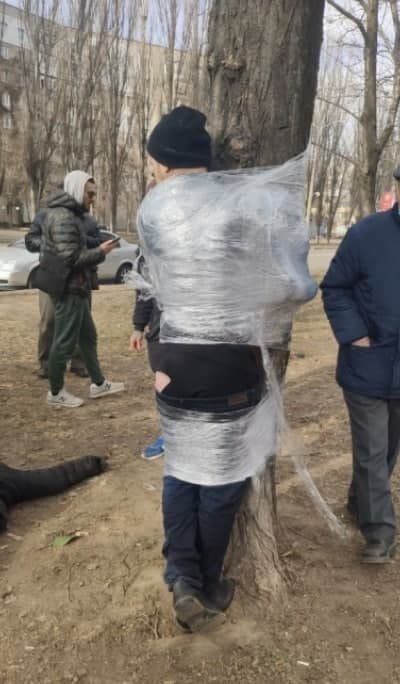 — Ошалевших с похмелья воришек выволокли на улицу, надавали «пилюлей» и по традиции примотали упаковочной пленкой к «позорному столбу», в качестве которого в этот раз выступило дерево, — написал Telegram-канал «Новости Николаева».