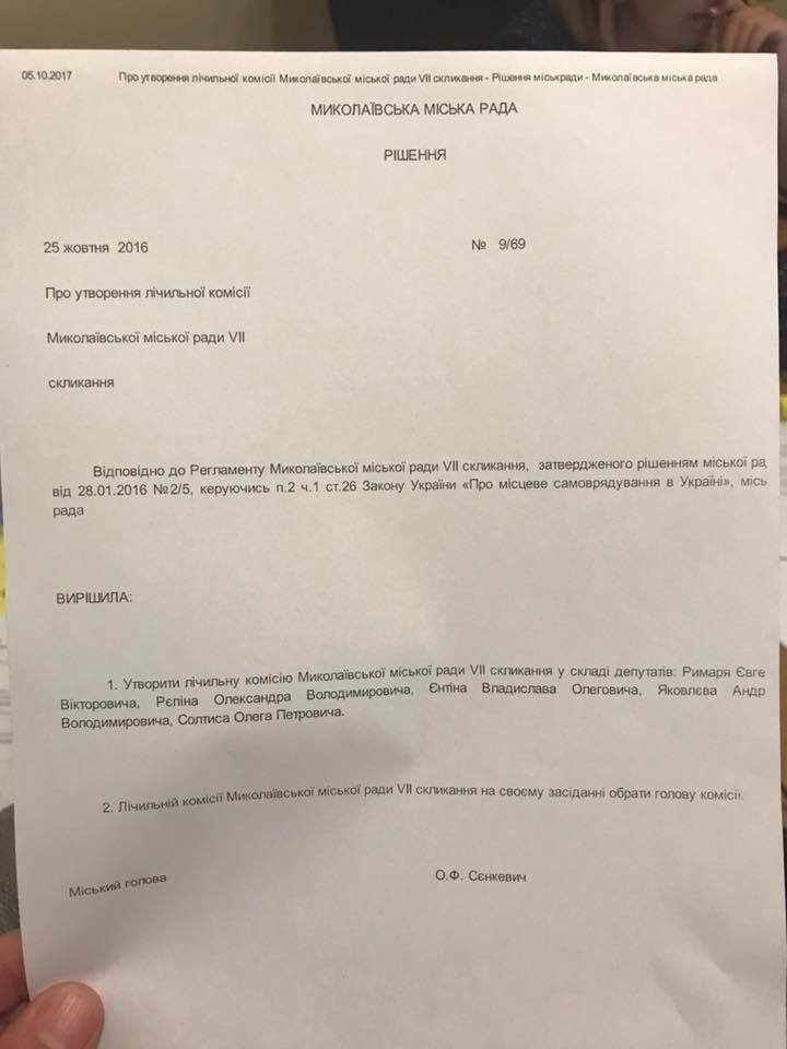В пояснении к проекту решения субъект подачи документа указывает на признание судом факта нарушения Николаевским городским головой Александром Сенкевичем части 3 статьи 184 Кодекса законов о труде Украины, а также наличие в действиях Николаевского городского головы признаков нарушений части 2 статьи 19, статьи 43, статьи 1291 Конституции Украины; части 3 статьи 21 пункта 8 статьи 36, части 3 статьи 184 Кодекса законов о труде Украины; части 1, 2 статьи 172-7 Кодекса Украины об административных правонарушениях; статьи 366, 382 Уголовного кодекса Украины; части 10 статьи 46, части 5 статьи 47, части 4 статьи 59, части 1 статьи 59-1 Закона Украины «О местном самоуправлении в Украине»; части 2 статьи 28 Закона Украины «О статусе депутатов местных советов»; пунктов 2,3 части 1 статьи 28 части 2 статьи 35 Закона Украины «О предотвращении коррупции»; части 3 статьи 15 Закона Украины «О доступе к публичной информации в Украине»; ст. 34 Закона Украины «Об основах государственной регуляторной политики в сфере хозяйственной деятельности»; статьи 4, 11 Закона Украины «О службе в органах местного самоуправления».