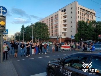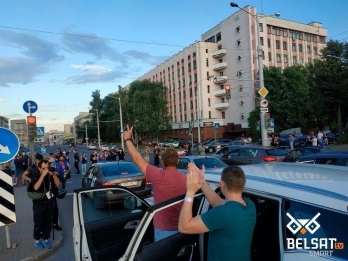 В 21:30 протестующие, которых уже около тысячи человек, заняли проезжую часть возле бизнес-центра Royal Plaza на проспекте Победителей. ОМОН выстроился напротив. Силовики просят не нарушать законодательство.