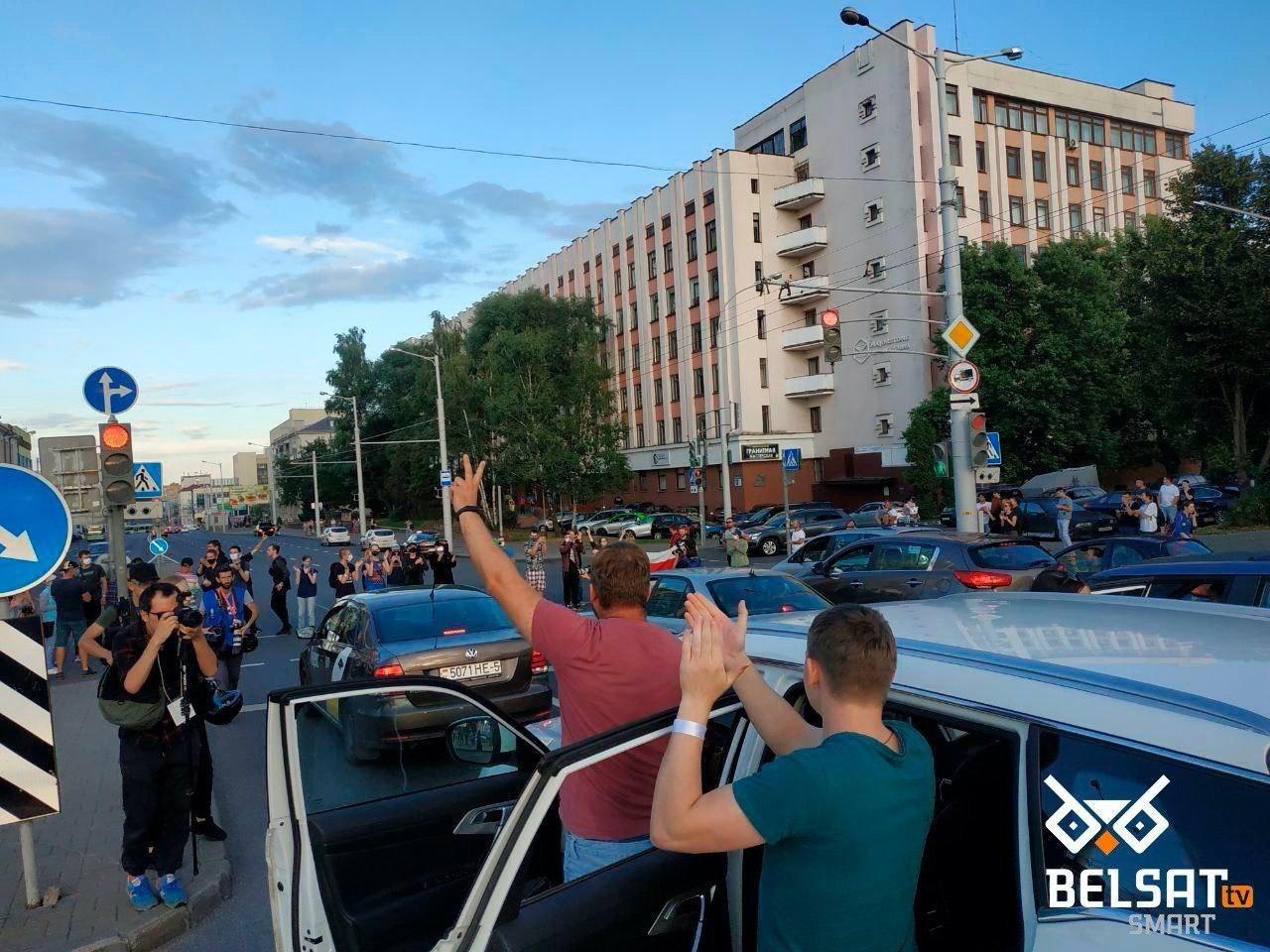 На улице Кальварийской протестующие перекрыли дорогу. На перекрестке Кальварийской и проспекта Машерова корреспондент TUT.BY услышал три залпа — взорвалась светошмуовая граната. Отмечаеися, что патрули ГАИ останавливают автомобили, которые сигналят.