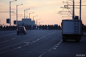 Отмечается, что правоохранительные органы установили пункты пропуска. Корреспонденты стали свидетелями того, как ОМОН задержал пешехода и велосипедиста. В районе стелы возле Дворца спорта в Минске стоят автобусы с силовиками и автозаки.