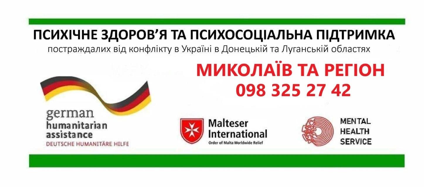 Центр Психічного Здоров'я в Миколаєві та регіоні реалізує ГО «Підтримка психічного здоров'я – асоціація фахівців у галузі психічного здоров'я» в рамках проекту «Психічне здоров'я та психосоціальна підтримка постраждалих від конфлікту в Україні» за сприяння Міністерства закордонних справ Німеччини, Malteser International та Мальтійської служби допомоги Україна - Львів.