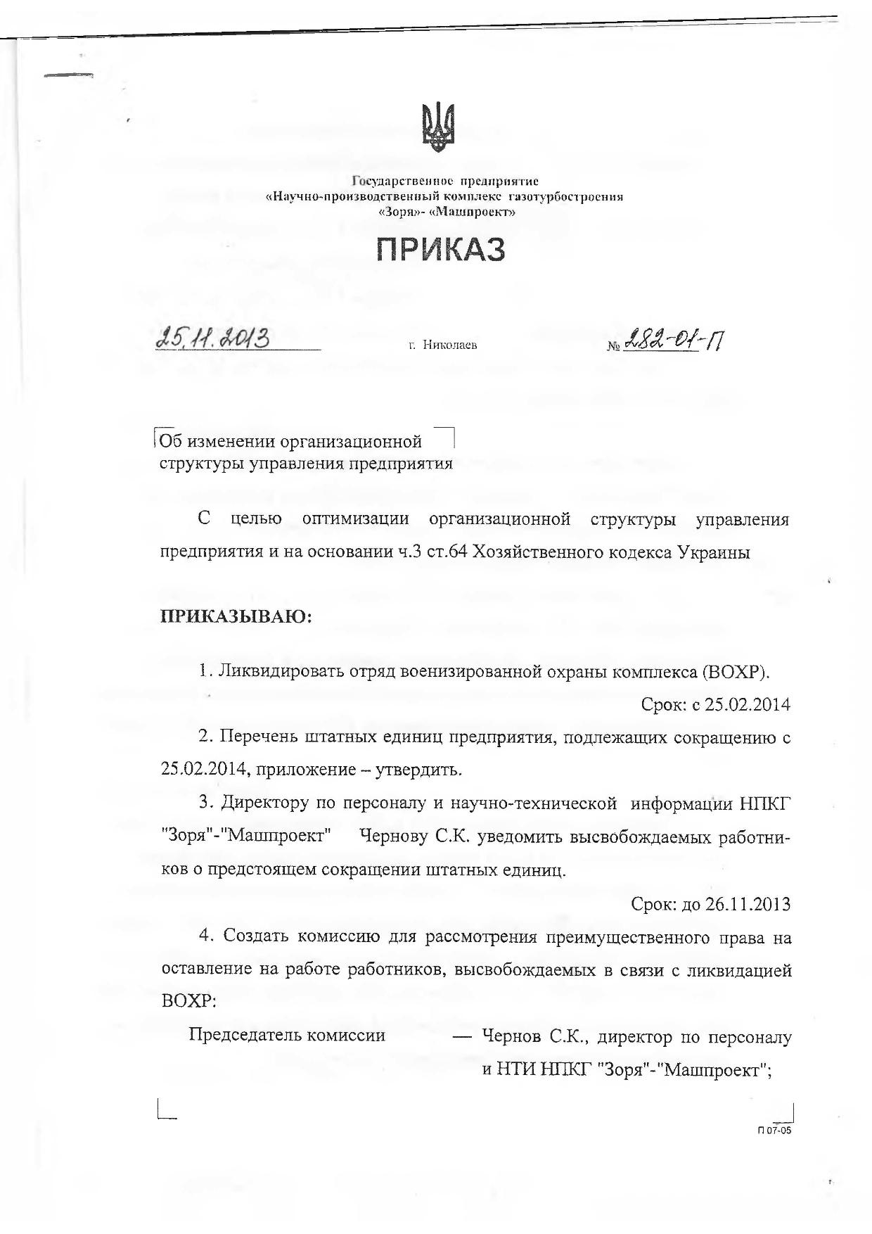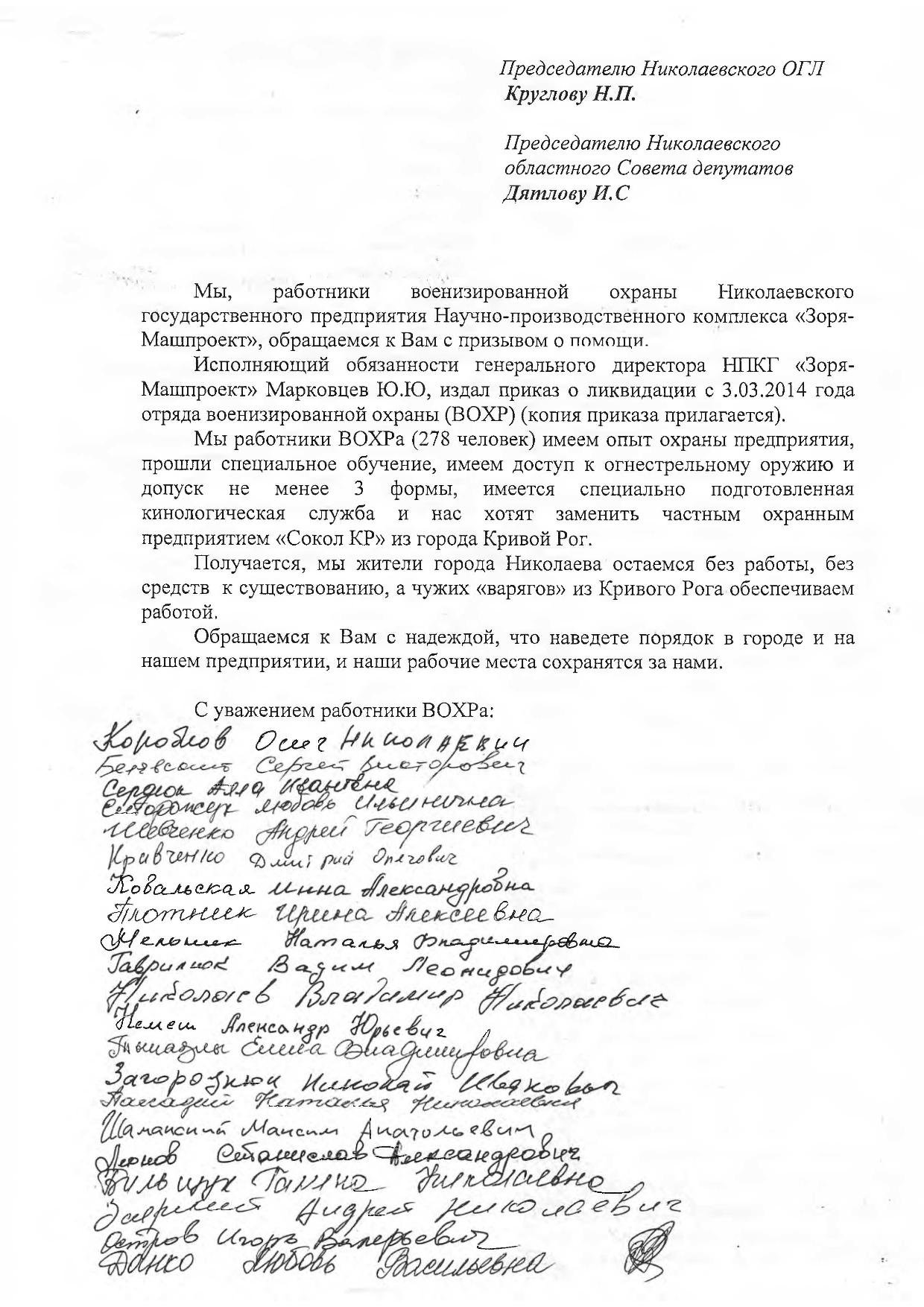 Так, 25 ноября, приказом и.о. Генерального директора Юрия Марковцева ликвидирован отряд военизированной охраны комплекса из 275 человек. На место почти трехсот жителей Николаева, выброшенных на улицу, набираются работники криворожского частного предприятия «Сокол КР».